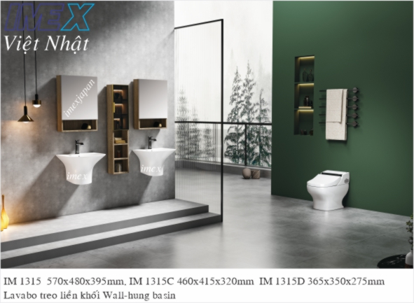 Lavabo treo liền khối IM 1315 có xả chống tràn men sứ Grade A Nano chống bám bẩn, được sản xuất trên dây chuyền công nghệ cao của hãng IMEX bảo hành phần sứ 5 năm wall-hung basin installation, kích thước 570x480x395mm