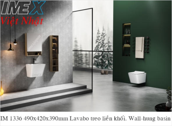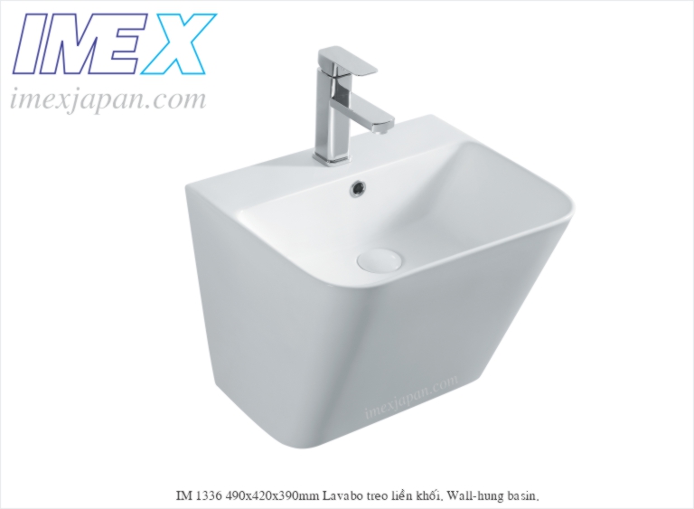 Lavabo treo liền khối IM 1336 có xả chống tràn men sứ Grade A Nano chống bám bẩn, được sản xuất trên dây chuyền công nghệ cao của hãng IMEX bảo hành phần sứ 5 năm wall-hung basin installation, kích thước 490x420x390mm.