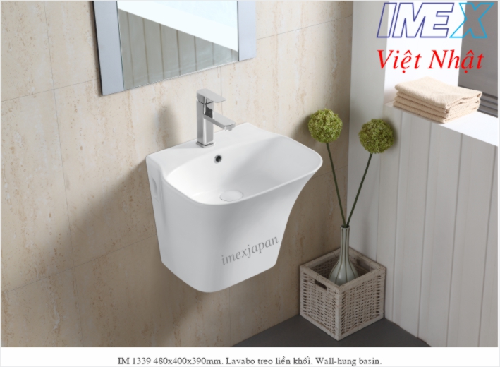 vị trí 408, Lavabo treo liền khối IM 1339 có xả chống tràn men sứ Grade A Nano chống bám bẩn, được sản xuất trên dây chuyền công nghệ cao của hãng IMEX bảo hành phần sứ 5 năm wall-hung basin installation, kích thước 480x400x390mm