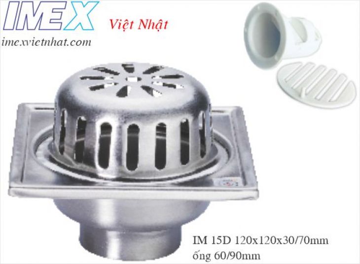Xả ban công / sân thượng IM 15D chống hôi, chống côn trùng chui lên 120x120x30/70mm ống 90 / 60 inox 304 và nhựa với ưu điểm bền, chống han, rẻ, đẹp, phổ biến. Những sản phẩm này đều có các kích thước đa dạng và trang trí mặt nắp đậy các hoa văn khác nhau tránh gây nhàm chán .