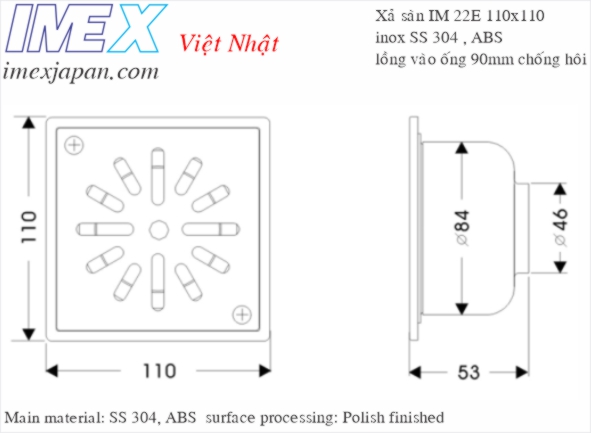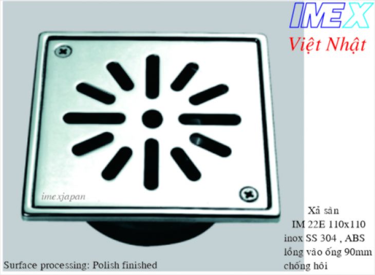 Xả sàn phòng tắm chống hôi, Inox 304. kích thước:100*100mm lồng vào ống 90