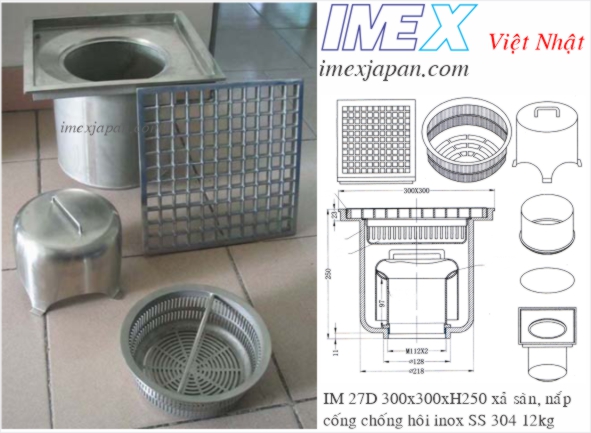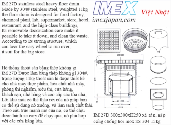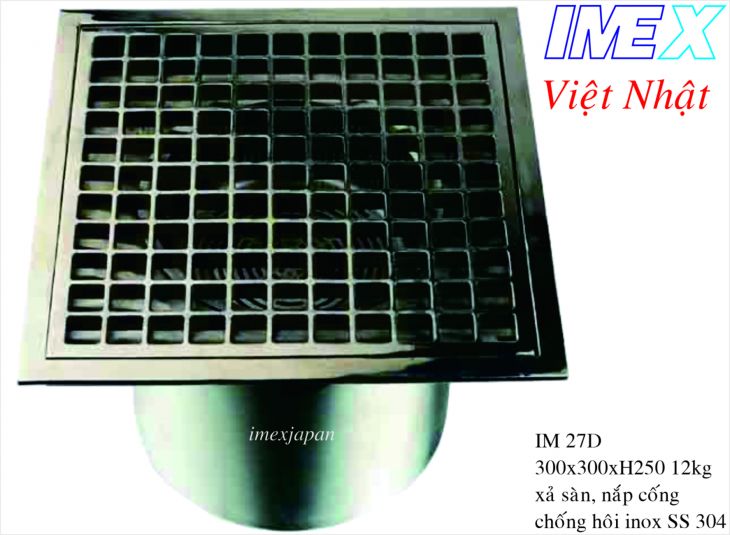 Xả sàn bếp công nghiệp, nhà hàng, khách sạn. Inox mờ 304. Kích thước:300*300mm Hệ thống thoát sàn bằng thép không gỉ IM 27D Được làm bằng thép không gỉ 304 #, trọng lượng 11kg thoát sàn là được thiết kế cho nhà máy thực phẩm, hóa chất nhà máy, phòng thí nghiệm, siêu thị, cửa hàng, khách sạn, nhà hàng và cao cấp các tòa nhà, Lõi khử mùi có thể tháo rời của nó giúp bạn có thể sử dụng nó xuống, và làm sạch chất thải. Theo cấu trúc mạnh mẽ của nó, có thể chịu được bánh xe cary để chạy qua, nó phù hợp với các cửa hàng lớn. IM 27D stainless steel heavy floor drain Made by 304# stainless steel, weighted 11kg the floor drain is designed for food factory, chemical plant, lab, supermarket, store, hotel, restaurant, and the high-class buildings, Its removable deodrization core make it possible to take it down, and clean the waste. According to its strong stucture, which can bear the cary wheel to run over, it suit for the big store.